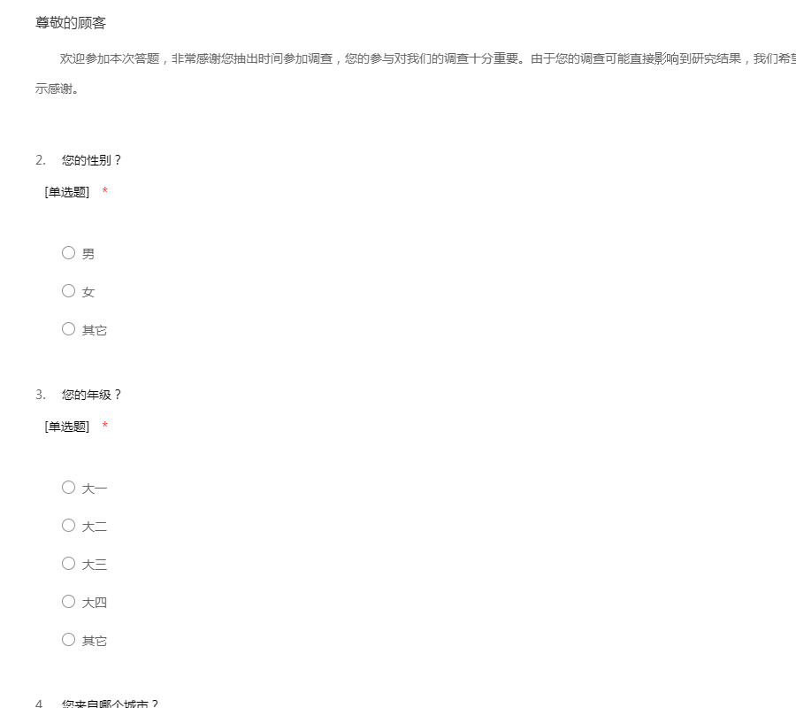 欢迎参加本次答题,非常感谢您抽出时间参加调查,您的参与对我们的调查十分重要。由于您的调查可能直接影响到研究结果,我们希望您能如实准确作答。最后,再次对您表示感谢。