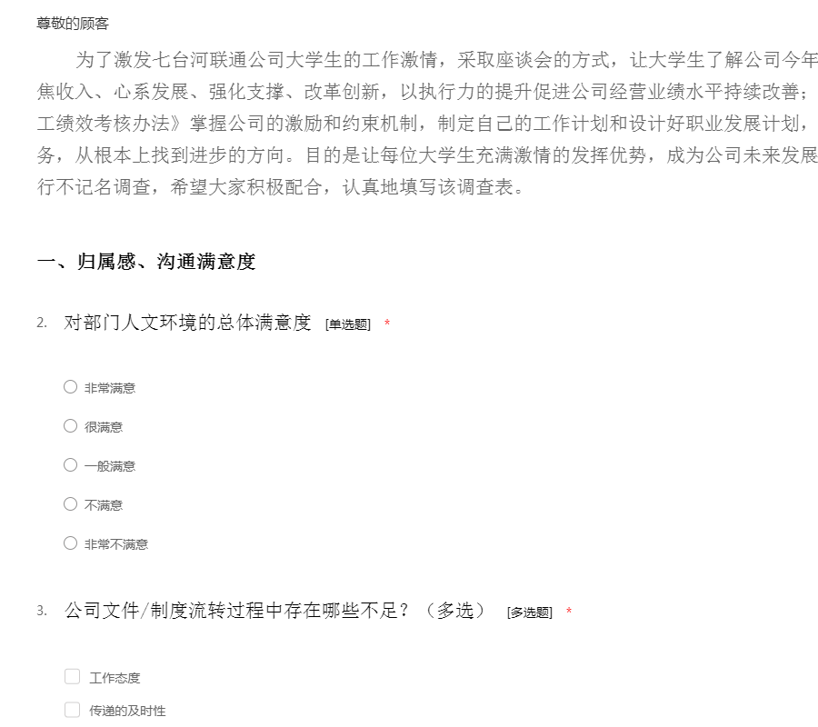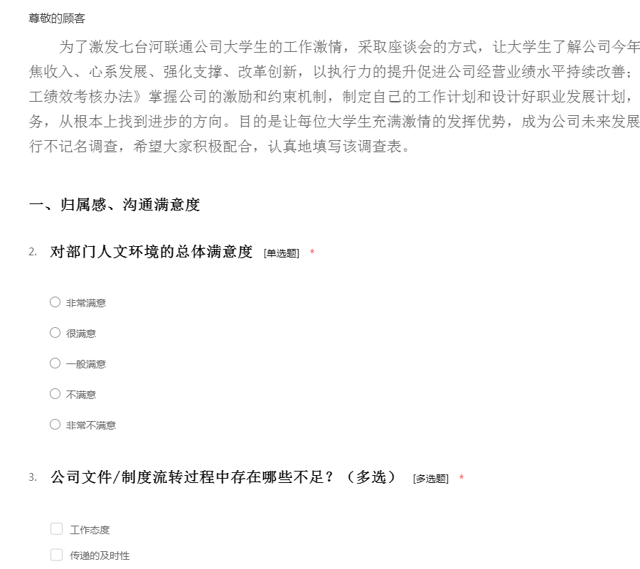 为了激发七台河联通公司大学生的工作激情,采取座谈会的方式,让大学生了解公司今年的发展战略和工作导向,聚焦收入、心系发展、强化支撑、改革创新,以执行力的提升促进公司经营业绩水平持续改善;认真学习《2014年部门和员工绩效考核办法》掌握公司的激励和约束机制,制定自己的工作计划和设计好职业发展计划,去立足本岗为经营发展服务,从根本上找到进步的方向。目的是让每位大学生充满激情的发挥优势,成为公司未来发展的生力军。现对公司员工进行不记名调查,希望大家积极配合,认真地填写该调查表。