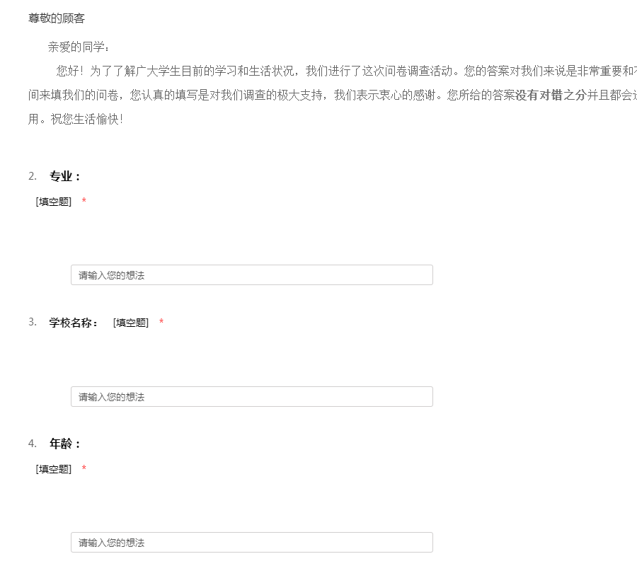 亲爱的同学: 您好!为了了解广大学生目前的学习和生活状况,我们进行了这次问卷调查活动。您的答案对我们来说是非常重要和有价值的,非常抱歉占用您的宝贵时间来填我们的问卷,您认真的填写是对我们调查的极大支持,我们表示衷心的感谢。您所给的答案没有对错之分并且都会进行保密处理,仅做数据统计分析之用。祝您生活愉快!