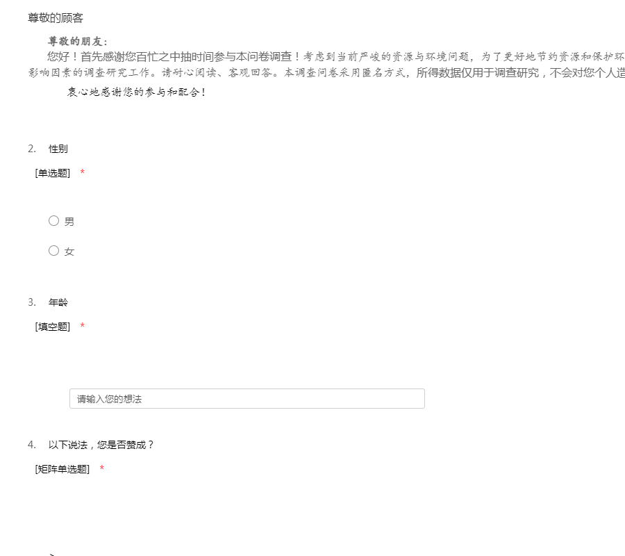 尊敬的朋友: 您好!首先感谢您百忙之中抽时间参与本问卷调查!考虑到当前严峻的资源与环境问题,为了更好地节约资源和保护环境,本问卷开展居民日常环境行为及影响因素的调查研究工作。请耐心阅读、客观回答。本调查问卷采用匿名方式,所得数据仅用于调查研究,不会对您个人造成任何不良影响。 衷心地感谢您的参与和配合!