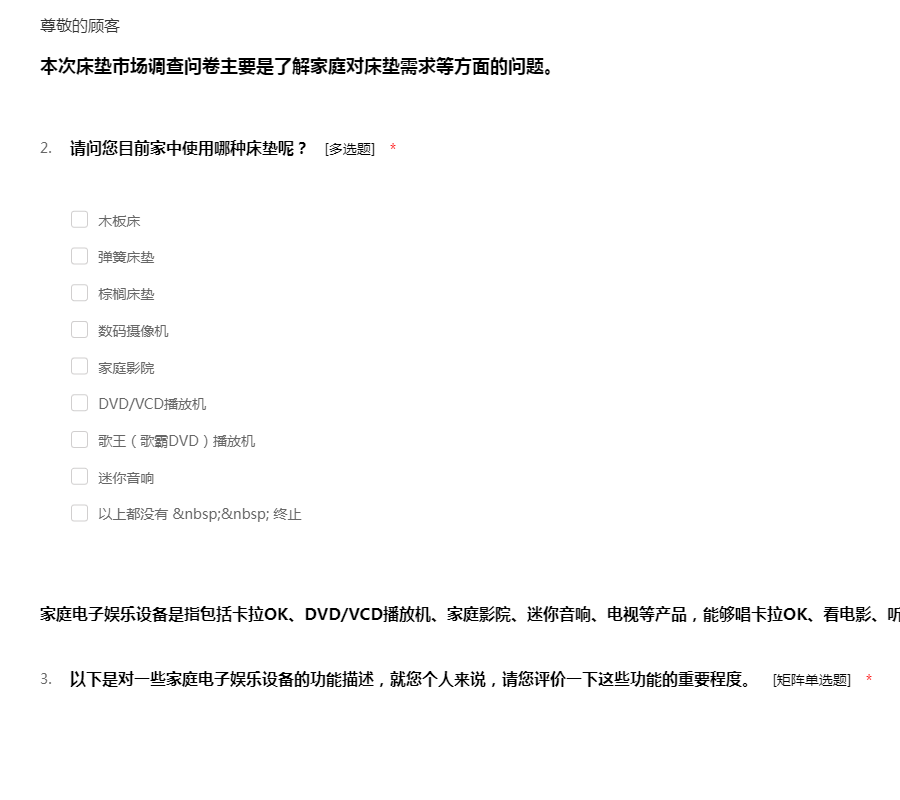本次床垫市场调查问卷主要是了解家庭对床垫需求等方面的问题。