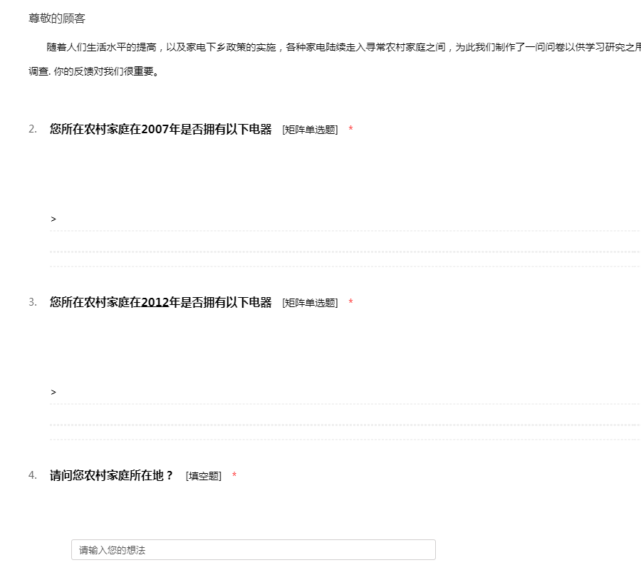 随着人们生活水平的提高,以及家电下乡政策的实施,各种家电陆续走入寻常农村家庭之间,为此我们制作了一问问卷以供学习研究之用,谢谢您的回答!感谢你参加我们的问卷调查. 你的反馈对我们很重要。
