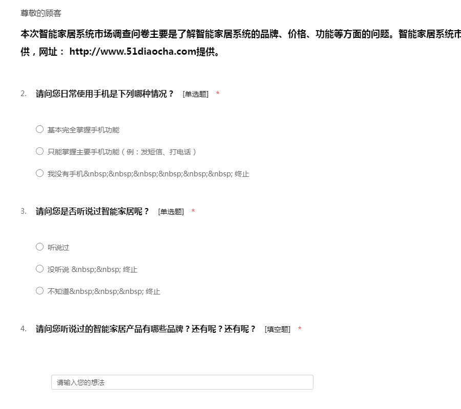 本次智能家居系统市场调查问卷主要是了解智能家居系统的品牌、价格、功能等方面的问题。智能家居系统市场调查问卷模板由我要调查网提供,网址: http://www.51diaocha.com提供。