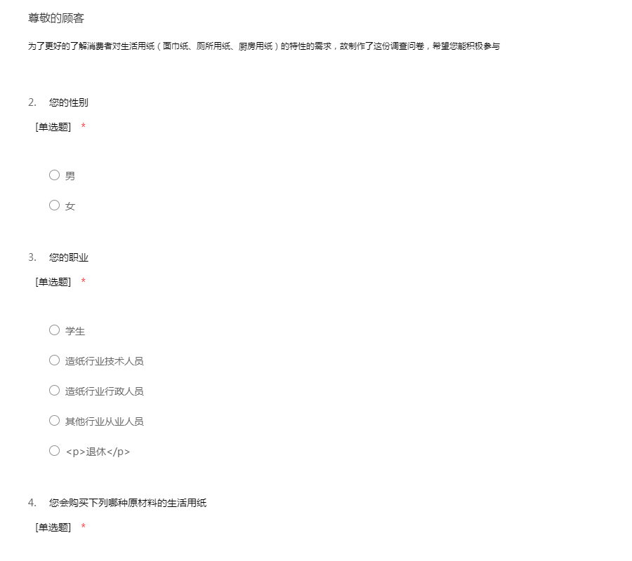 为了更好的了解消费者对生活用纸(面巾纸、厕所用纸、厨房用纸)的特性的需求,故制作了这份调查问卷,希望您能积极参与