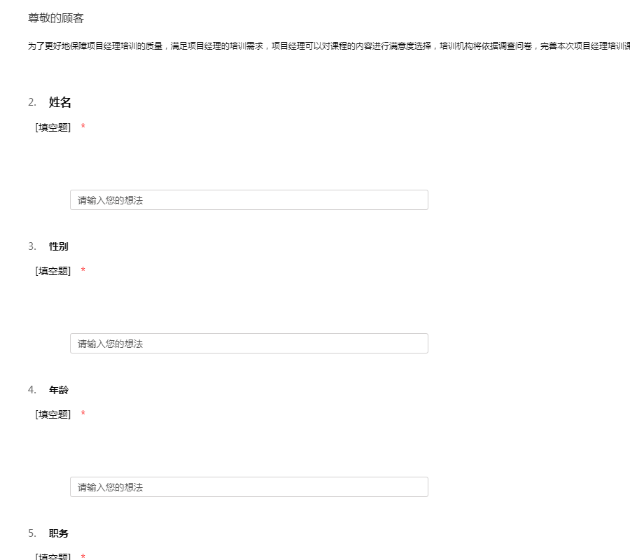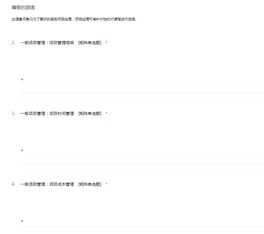 此调查问卷只为了更好的服务项目经理,项目经理可有针对性的对课程进行选择。