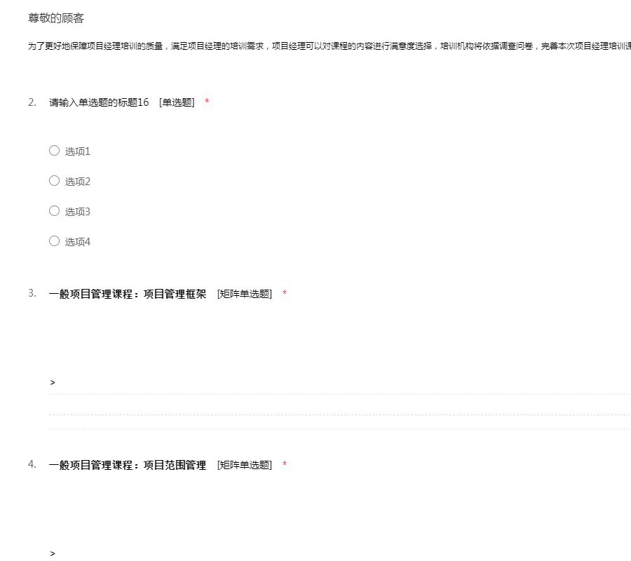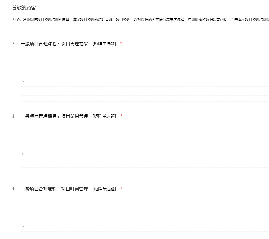 为了更好地保障项目经理培训的质量,满足项目经理的培训需求,项目经理可以对课程的内容进行满意度选择,培训机构将依据调查问卷,完善本次项目经理培训课程设置。