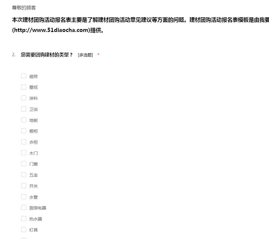 本次建材团购活动报名表主要是了解建材团购活动意见建议等方面的问题。建材团购活动报名表模板是由我要调查网(http://www.51diaocha.com)提供。