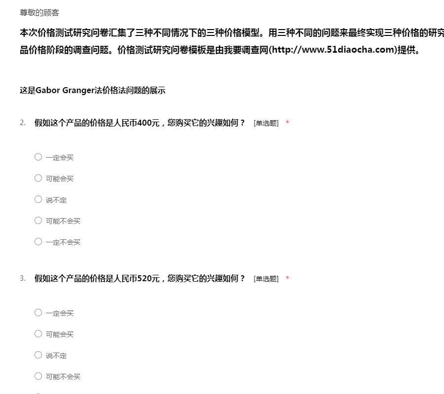 本次价格测试研究问卷汇集了三种不同情况下的三种价格模型。用三种不同的问题来最终实现三种价格的研究,您可以从中挑选出适合你的产品价格阶段的调查问题。价格测试研究问卷模板是由我要调查网(http://www.51diaocha.com)提供。