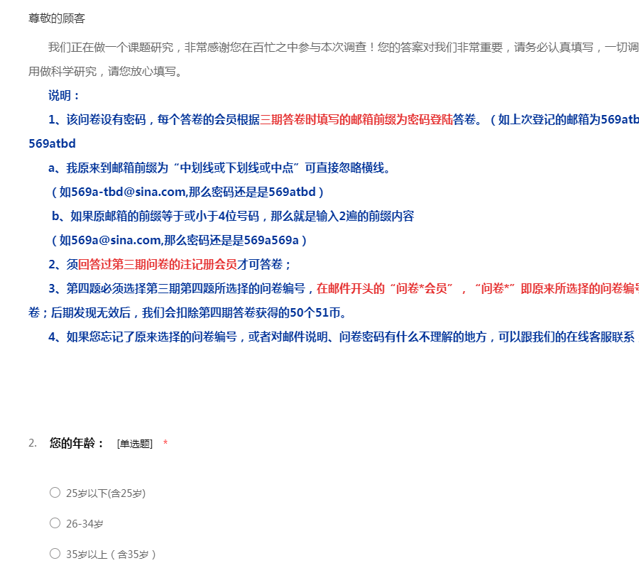 1、该问卷设有密码,每个答卷的会员根据三期答卷时填写的邮箱前缀为密码登陆答卷。(如上次登记的邮箱为569atbd@sina.com,那么密码就是569atbd