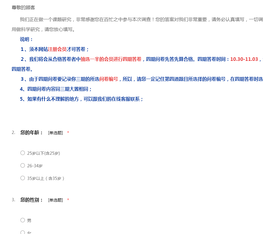 2、我们将会从合格答卷者中抽选一半的会员进行四期答卷,四期问卷先答先算合格。四期答卷时间:10.30-11.03,请您确保在这期间能够抽出时间参与四期答卷。