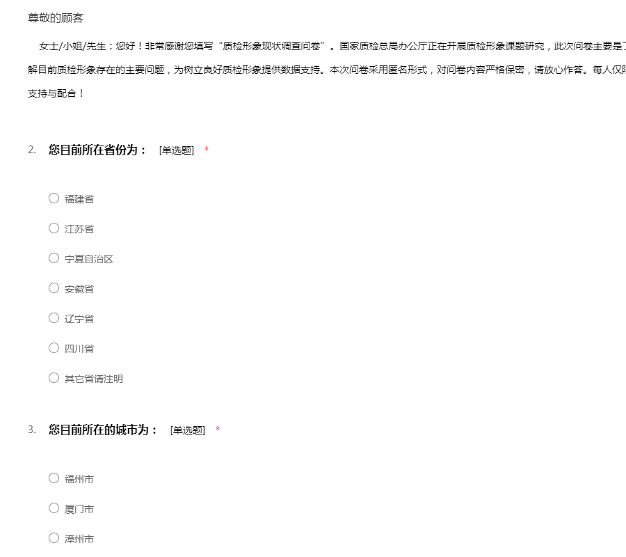 女士/小姐/先生:您好!非常感谢您填写“质检形象现状调查问卷”。国家质检总局办公厅正在开展质检形象课题研究,此次问卷主要是了解社会公众对质检形象现状的评价,了解目前质检形象存在的主要问题,为树立良好质检形象提供数据支持。本次问卷采用匿名形式,对问卷内容严格保密,请放心作答。每人仅限提交一份,请如实填写。非常感谢您的支持与配合!