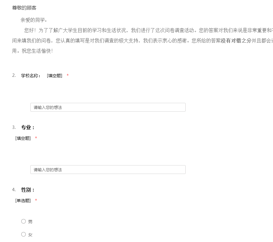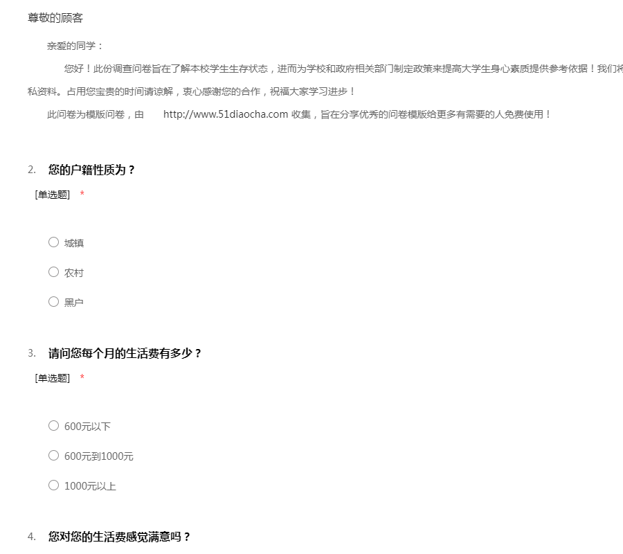 亲爱的同学: 您好!此份调查问卷旨在了解本校学生生存状态,进而为学校和政府相关部门制定政策来提高大学生身心素质提供参考依据!我们将严格按照保密原则不对外泄露您的个人隐私资料。占用您宝贵的时间请谅解,衷心感谢您的合作,祝福大家学习进步! 此问卷为模版问卷,由http://www.51diaocha.com 收集,旨在分享优秀的问卷模版给更多有需要的人免费使用!