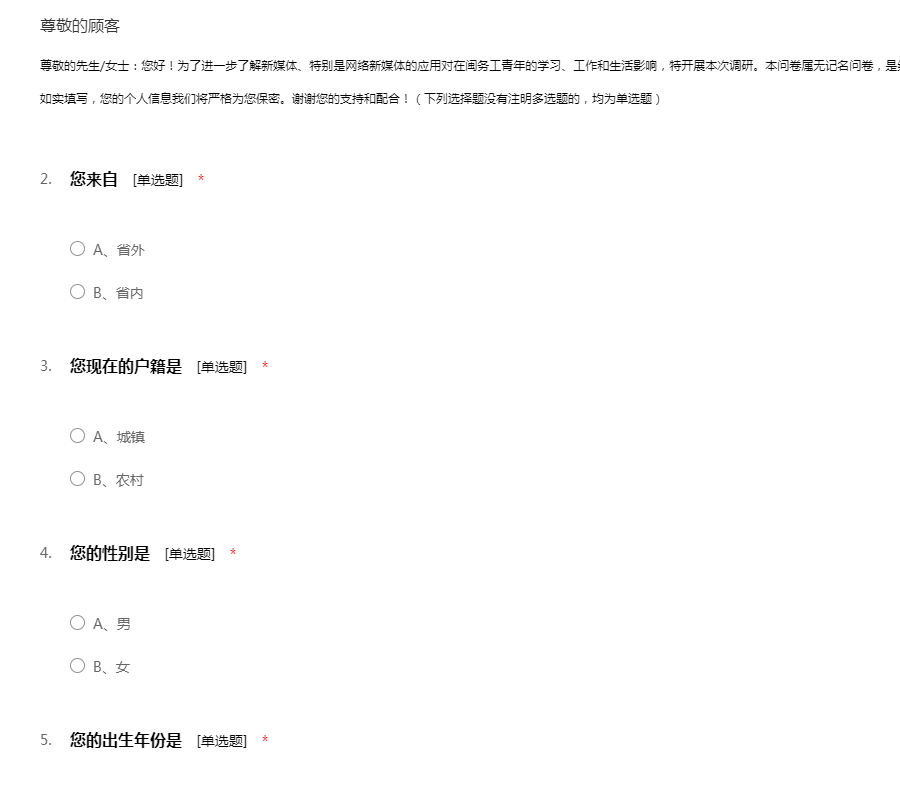 尊敬的先生/女士:您好!为了进一步了解新媒体、特别是网络新媒体的应用对在闽务工青年的学习、工作和生活影响,特开展本次调研。本问卷属无记名问卷,是纯学术性调研,问题的回答没有对错之分,请您如实填写,您的个人信息我们将严格为您保密。谢谢您的支持和配合!(下列选择题没有注明多选题的,均为单选题)