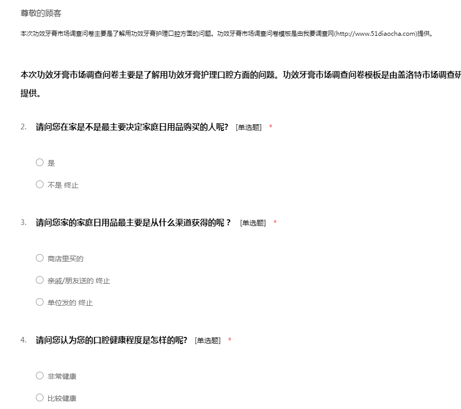 本次功效牙膏市场调查问卷主要是了解用功效牙膏护理口腔方面的问题。功效牙膏市场调查问卷模板是由我要调查网(http://www.51diaocha.com)提供。