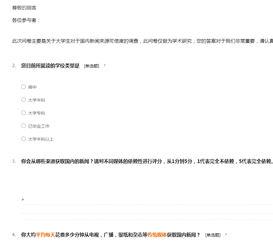 各位参与者: 此次问卷主要是关于大学生对于国内新闻来源可信度的调查,此问卷仅做为学术研究,您的答案对于我们非常重要,请认真填写。非常感谢您的参与!