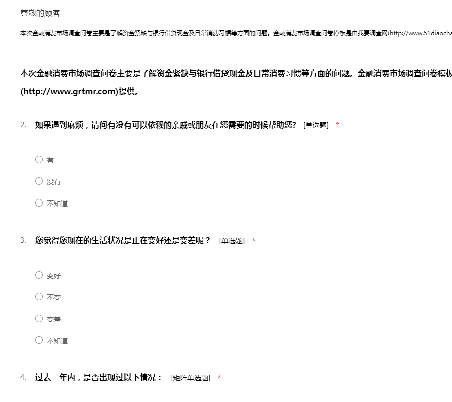 本次金融消费市场调查问卷主要是了解资金紧缺与银行借贷现金及日常消费习惯等方面的问题。金融消费市场调查问卷模板是由我要调查网(http://www.51diaocha.com)提供。