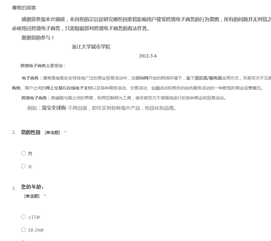 感谢您参加本次调研,本问卷的宗旨是研究哪些因素将影响用户接受跨境电子商务的行为意图,所有的问题并无对错之分,调查结果仅供科研使用。您不必使用过跨境电子商务,只需根据您对跨境电子商务的看法作答。