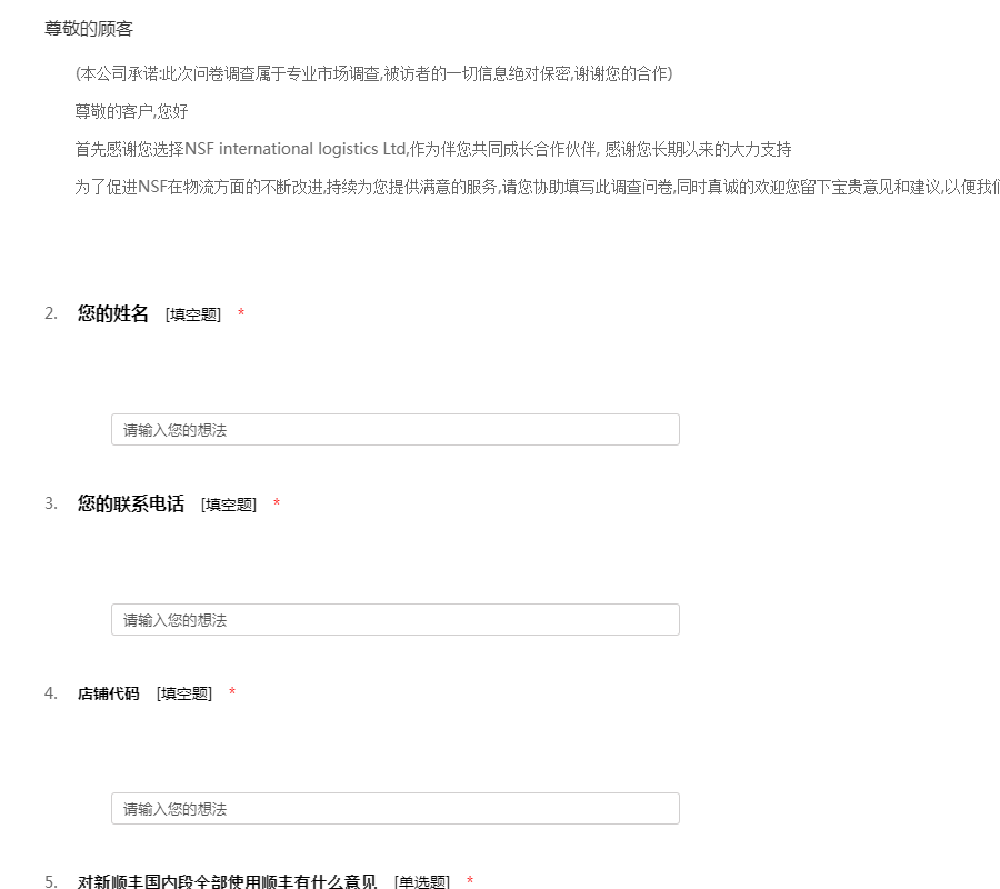 NSF INTERNATIONAL LOGISTIC LTD (本公司承诺:此次问卷调查属于专业市场调查,被访者的一切信息绝对保密,谢谢您的合作) 尊敬的客户,您好 首先感谢您选择NSF international logistics Ltd,作为伴您共同成长合作伙伴, 感谢您长期以来的大力支持 为了促进NSF在物流方面的不断改进,持续为您提供满意的服务,请您协助填写此调查问卷,同时真诚的欢迎您留下宝贵意见和建议,以便我们为您提供更专业的服务.