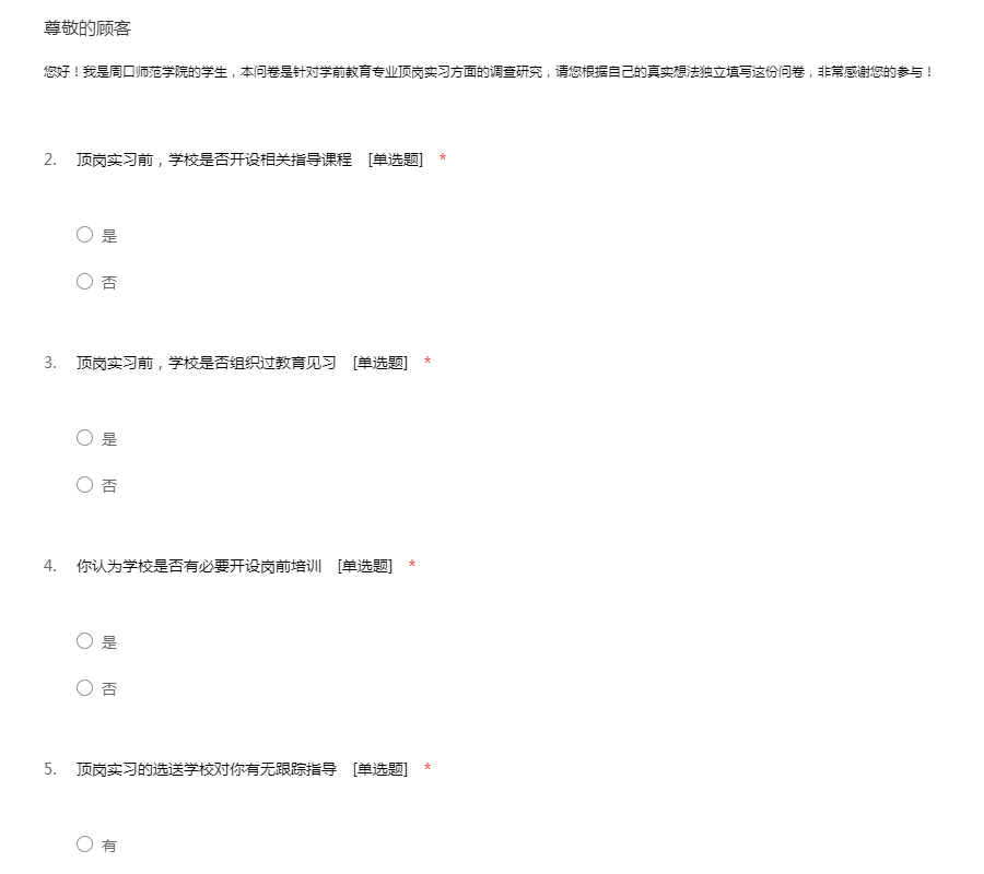 您好!我是周口师范学院的学生,本问卷是针对学前教育专业顶岗实习方面的调查研究,请您根据自己的真实想法独立填写这份问卷,非常感谢您的参与!