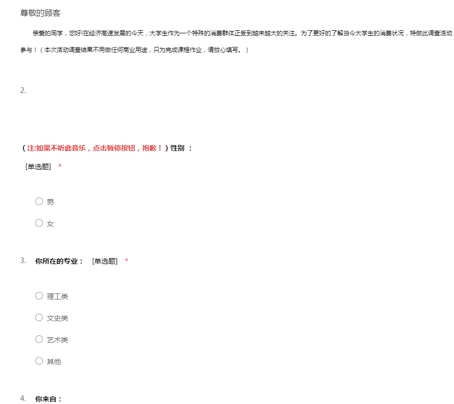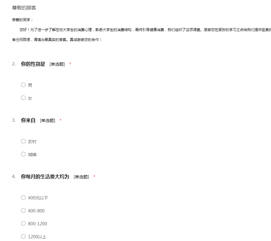 亲爱的同学,您好!在经济高速发展的今天,大学生作为一个特殊的消费群体正受到越来越大的关注。为了更好的了解当今大学生的消费状况,特做此调查活动,望您在百忙之中完成此份问卷。真诚感谢您的参与!(本次活动调查结果不用做任何商业用途,只为完成课程作业,请放心填写。)