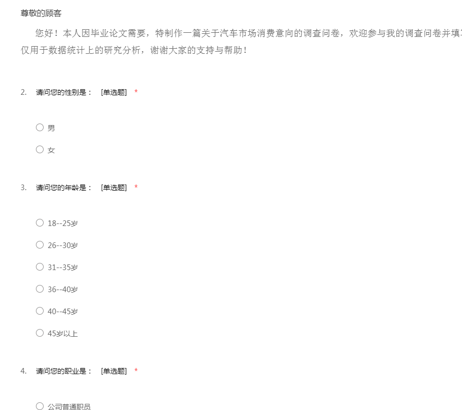 您好!本人因毕业论文需要,特制作一篇关于汽车市场消费意向的调查问卷,欢迎参与我的调查问卷并填写您的个人资料,您提供的信息仅用于数据统计上的研究分析,谢谢大家的支持与帮助!
