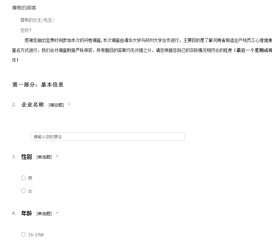 尊敬的女生/先生: 您好! 感谢您抽出宝贵时间参加本次的问卷调查,本次调查由清华大学与郑州大学合作进行,主要目的是了解河南省制造业产线员工心理健康状况。调查数据仅用于学术研究,调査以匿名方式进行,我们会对调查数据严格保密,所有题目的答案均无对错之分,请您根据您自己的实际情况相符合的程度(最近一个星期或现在),选择一个适当的选项,感谢您的合作!