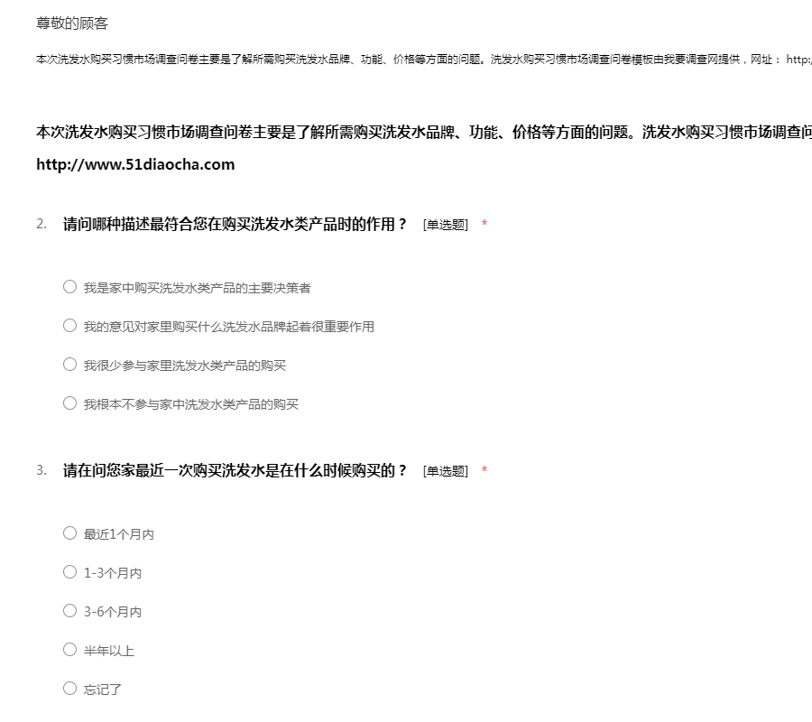 本次洗发水购买习惯市场调查问卷主要是了解所需购买洗发水品牌、功能、价格等方面的问题。洗发水购买习惯市场调查问卷模板由我要调查网提供,网址: http://www.51diaocha.com