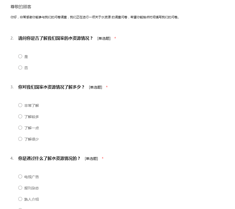 你好,非常感谢你能参与我们的问卷调查,我们正在进行一项关于水资源 的调查问卷,希望你能抽点时间填写我们的问卷。