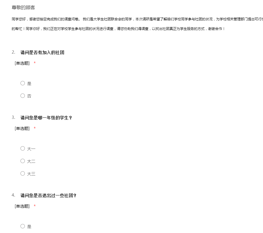 同学您好,感谢您抽空完成我们的调查问卷。 我们是大学生社团联合会的同学,本次调研是希望了解咱们学校同学参与社团的状况,为学校相关管理部门提出可行性的建议,从而优化学校社团管理制度。谢谢您的帮忙!同学你好,我们正在对学校学生参与社团的状况进行调查,请您协助我们得调查,以找出社团真正为学生服务的方式,谢谢合作!