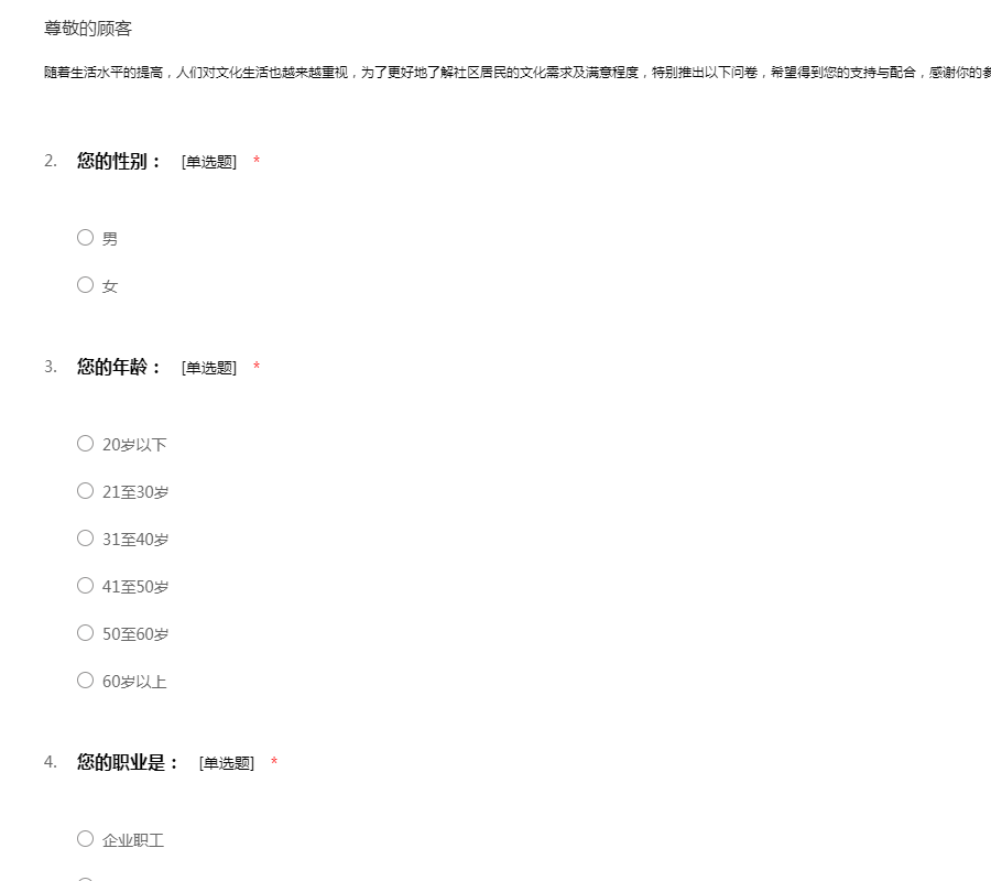 随着生活水平的提高,人们对文化生活也越来越重视,为了更好地了解社区居民的文化需求及满意程度,特别推出以下问卷,希望得到您的支持与配合,感谢你的参与。