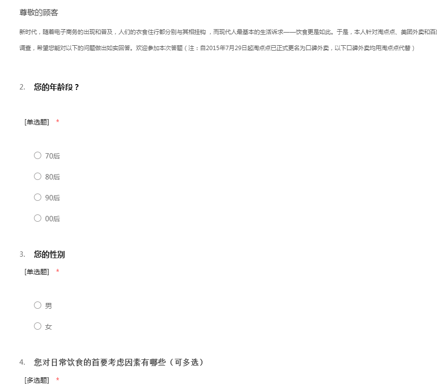 新时代,随着电子商务的出现和普及,人们的衣食住行都分别与其相挂钩 ,而现代人最基本的生活诉求——饮食更是如此。于是,本人针对淘点点、美团外卖和百度外卖做了一系列的调查研究。感谢您参与此次调查,希望您能对以下的问题做出如实回答。欢迎参加本次答题(注:自2015年7月29日起淘点点已正式更名为口碑外卖,以下口碑外卖均用淘点点代替)