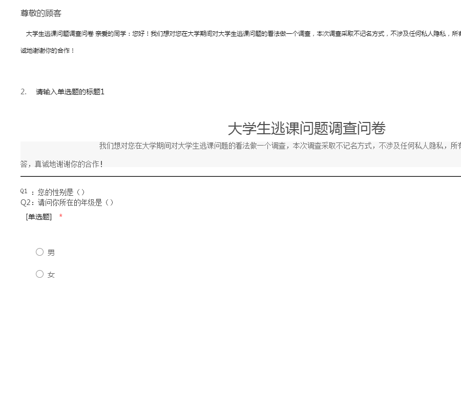 大学生逃课问题调查问卷 亲爱的同学:您好!我们想对您在大学期间对大学生逃课问题的看法做一个调查,本次调查采取不记名方式,不涉及任何私人隐私,所有问题答案都用于数据统计。请您如实回答,真诚地谢谢你的合作!