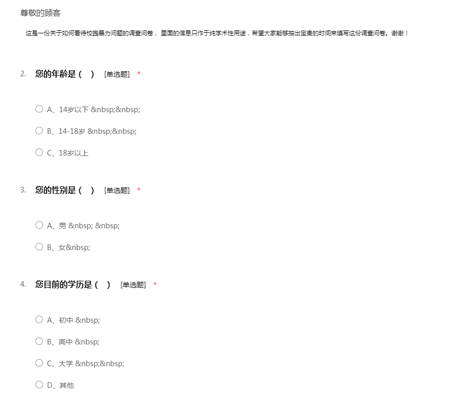 这是一份关于如何看待校园暴力问题的调查问卷, 里面的信息只作于纯学术性用途,希望大家能够抽出宝贵的时间来填写这份调查问卷。谢谢!
