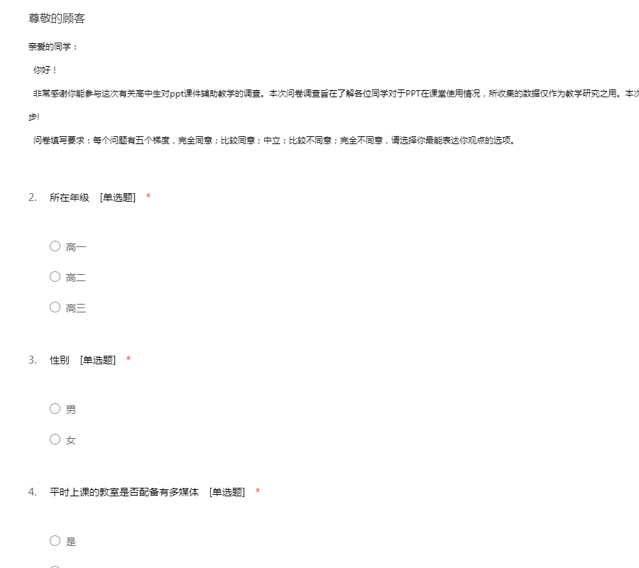 亲爱的同学: 你好! 非常感谢你能参与这次有关高中生对ppt课件辅助教学的调查。本次问卷调查旨在了解各位同学对于PPT在课堂使用情况,所收集的数据仅作为教学研究之用。本次调查为匿名调查,谢谢您的合作,祝你学习进步! 问卷填写要求:每个问题有五个梯度,完全同意;比较同意;中立;比较不同意;完全不同意,请选择你最能表达你观点的选项。