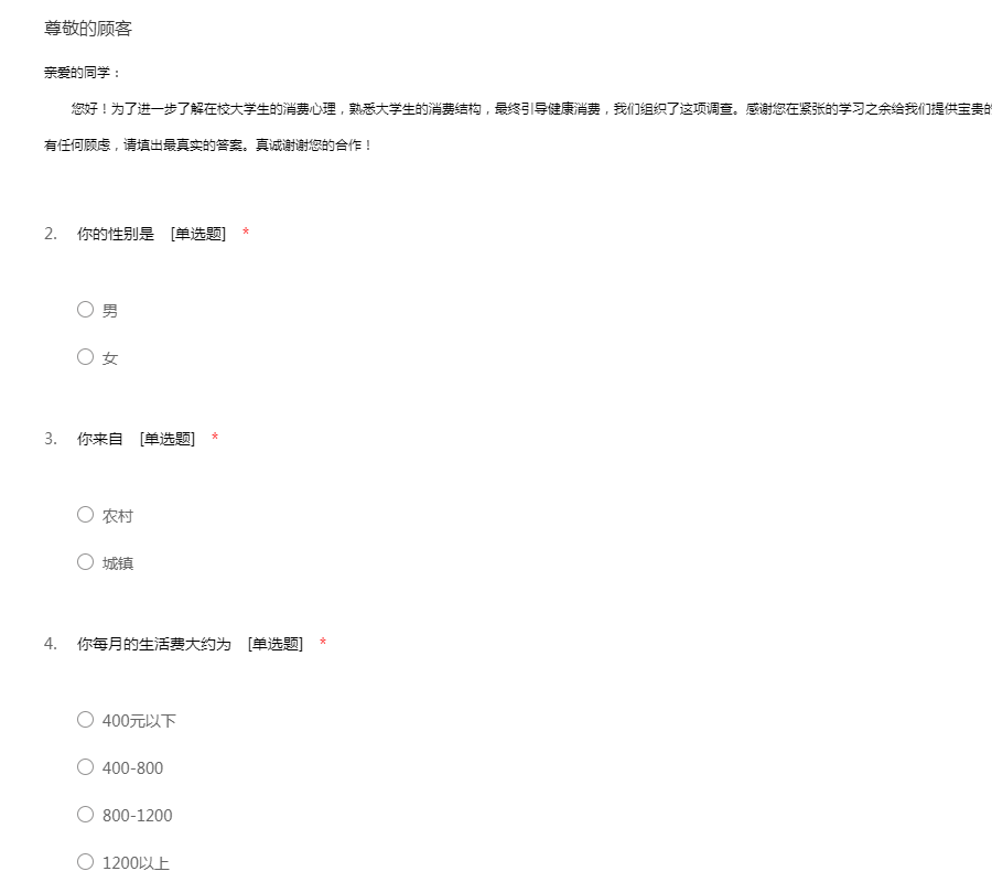 亲爱的同学: 您好!为了进一步了解在校大学生的消费心理,熟悉大学生的消费结构,最终引导健康消费,我们组织了这项调查。感谢您在紧张的学习之余给我们提供宝贵的信息与意见。此调查不记姓名,您在填表时不用有任何顾虑,请填出最真实的答案。真诚谢谢您的合作!