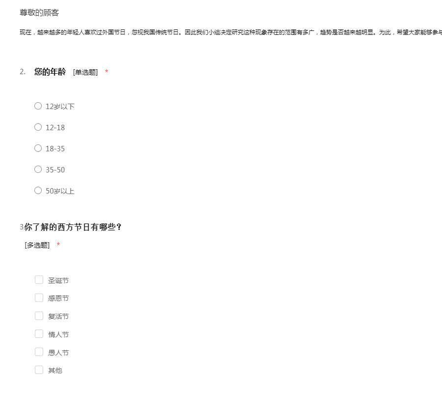现在,越来越多的年轻人喜欢过外国节日,忽视我国传统节日。因此我们小组决定研究这种现象存在的范围有多广,趋势是否越来越明显。为此,希望大家能够参与我们的问卷调查!!