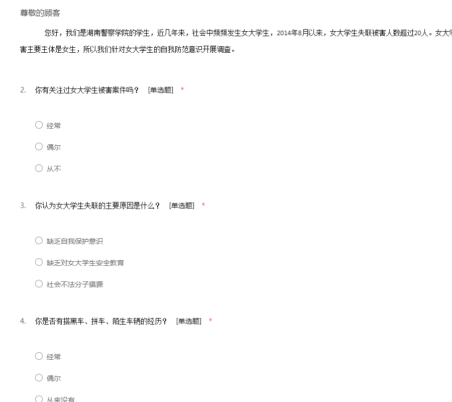 您好,我们是湖南警察学院的学生,近几年来,社会中频频发生女大学生,2014年8月以来,女大学生失联被害人数超过20人。女大学生失联被害问题牢牢占据话题榜首。受害主要主体是女生,所以我们针对女大学生的自我防范意识开展调查。