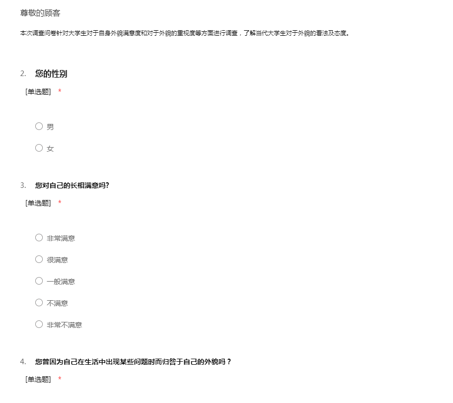 本次调查问卷针对大学生对于自身外貌满意度和对于外貌的重视度等方面进行调查,了解当代大学生对于外貌的看法及态度。