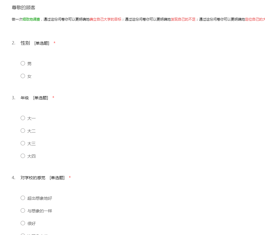 做一次细致地调查,通过这份问卷你可以更明确地确立自己大学的目标;通过这份问卷你可以更明确地发现自己的不足;通过这份问卷你可以更明确地定位自己的大学生活。请认真填写