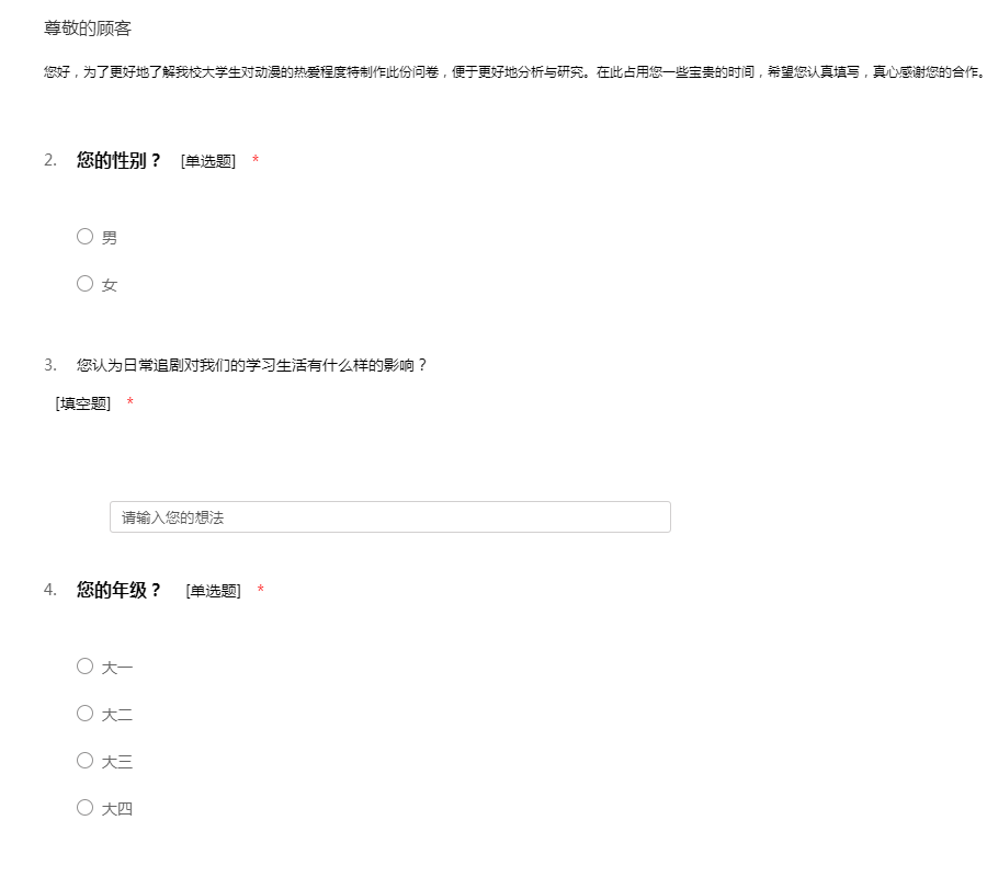 您好,为了更好地了解我校大学生对动漫的热爱程度特制作此份问卷,便于更好地分析与研究。在此占用您一些宝贵的时间,希望您认真填写,真心感谢您的合作。