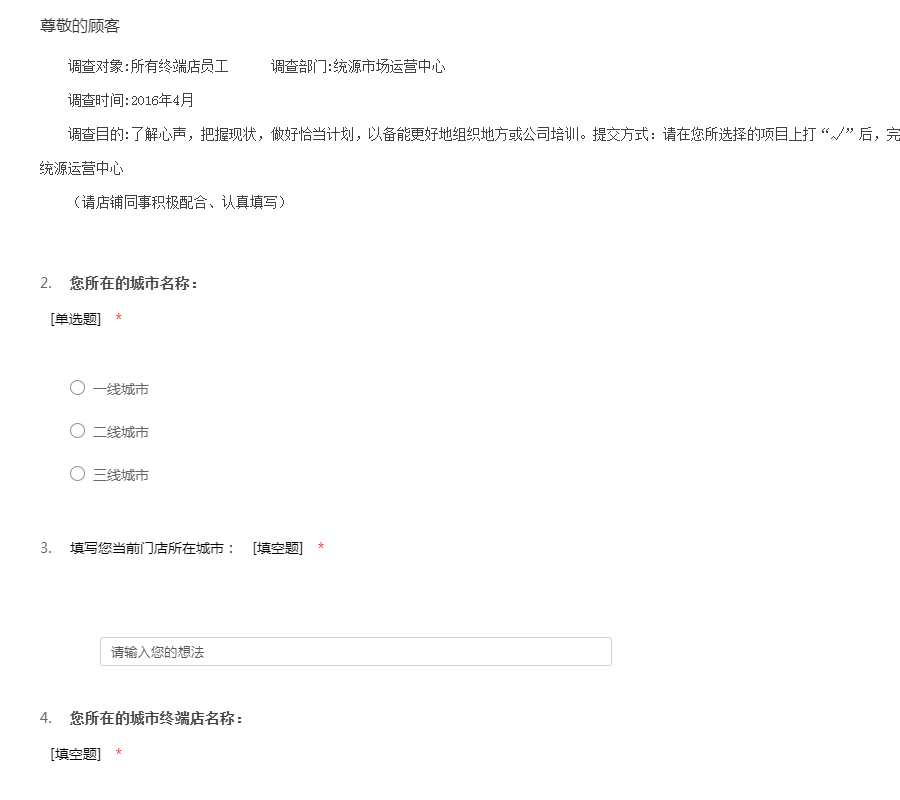 调查对象:所有终端店员工 调查部门:统源市场运营中心调查时间:2016年4月调查目的:了解心声,把握现状,做好恰当计划,以备能更好地组织地方或公司培训。提交方式:请在您所选择的项目上打“√”后,完成答卷后,交于地方代理商统一反馈广州统源运营中心(请店铺同事积极配合、认真填写)