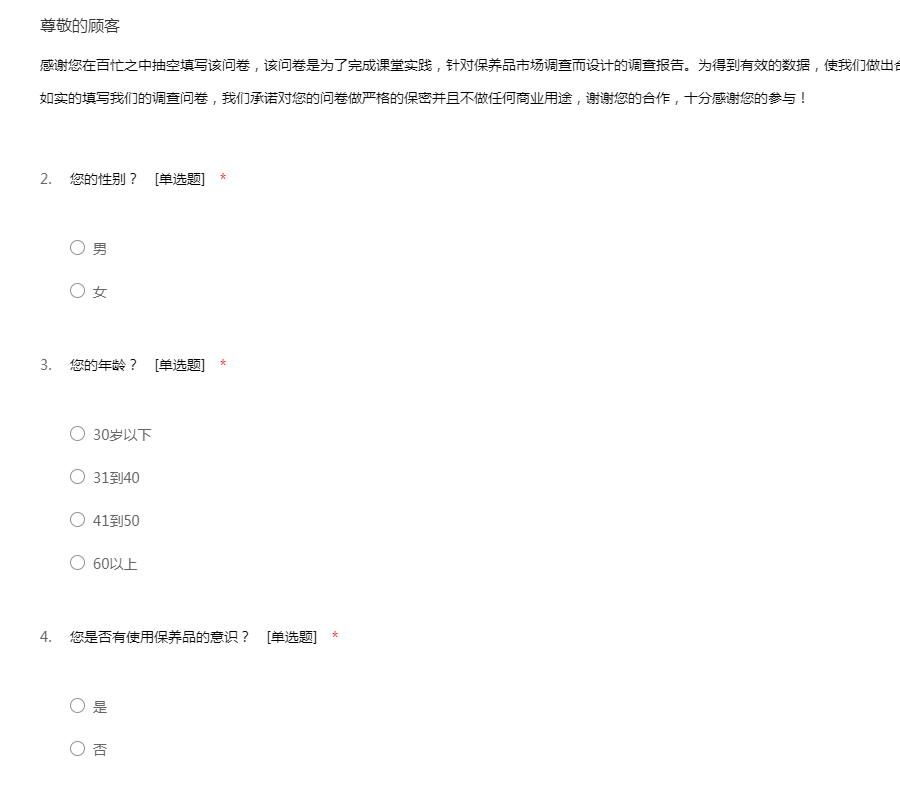 感谢您在百忙之中抽空填写该问卷,该问卷是为了完成课堂实践,针对保养品市场调查而设计的调查报告。为得到有效的数据,使我们做出合理分析,希望您给予我们帮助和支持,如实的填写我们的调查问卷,我们承诺对您的问卷做严格的保密并且不做任何商业用途,谢谢您的合作,十分感谢您的参与!