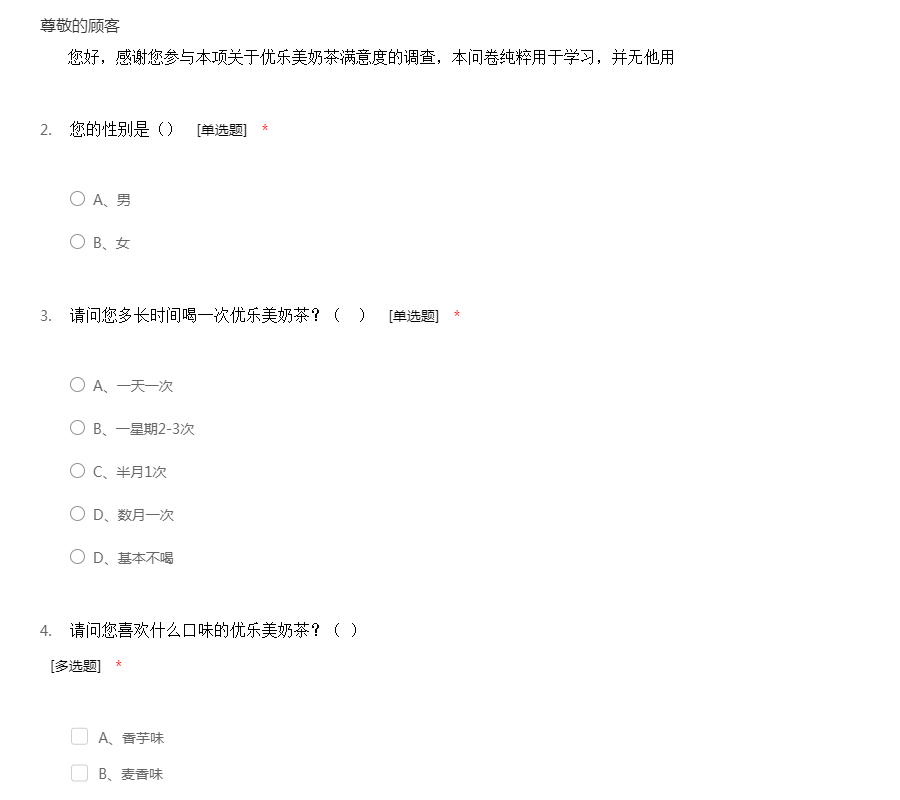 您好,感谢您参与本项关于优乐美奶茶满意度的调查,本问卷纯粹用于学习,并无他用