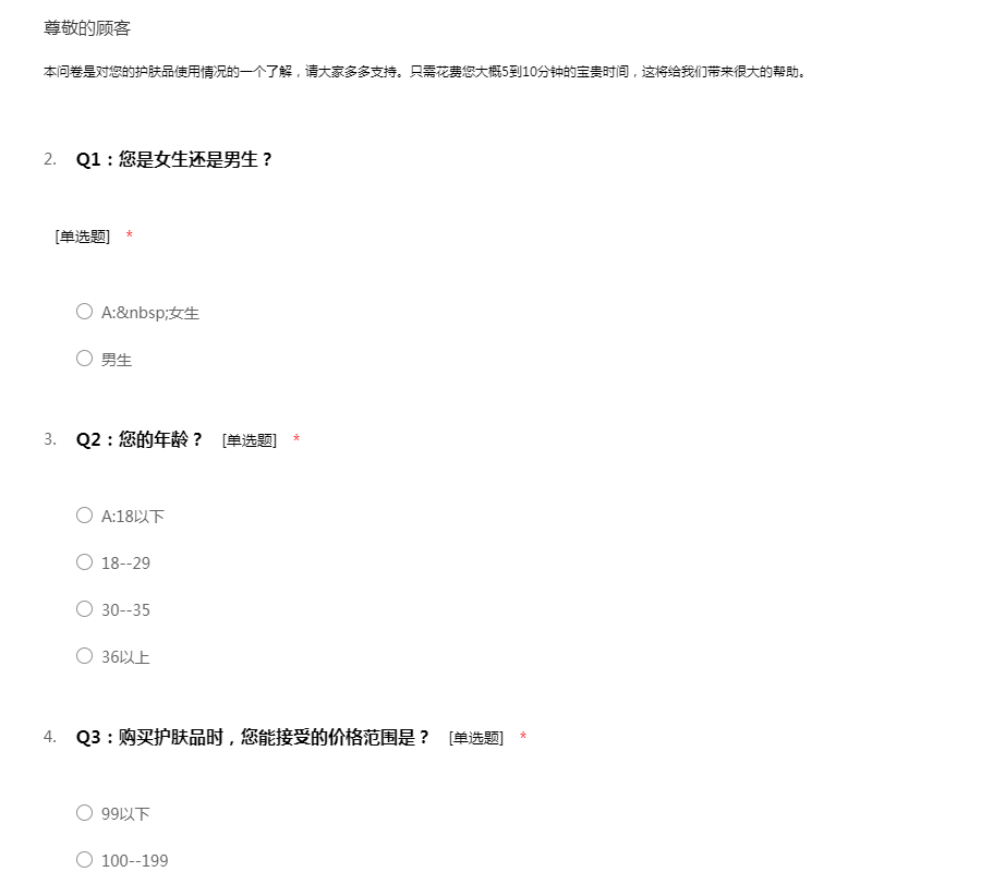 本问卷是对您的护肤品使用情况的一个了解,请大家多多支持。只需花费您大概5到10分钟的宝贵时间,这将给我们带来很大的帮助。