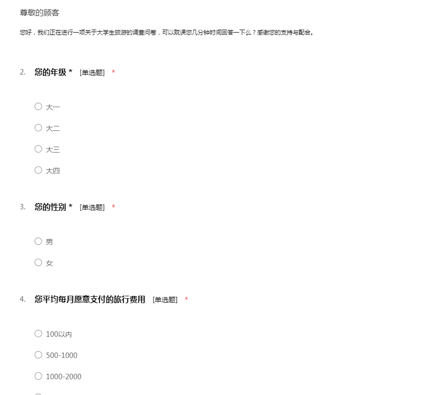 您好,我们正在进行一项关于大学生旅游的调查问卷,可以耽误您几分钟时间回答一下么?感谢您的支持与配合。