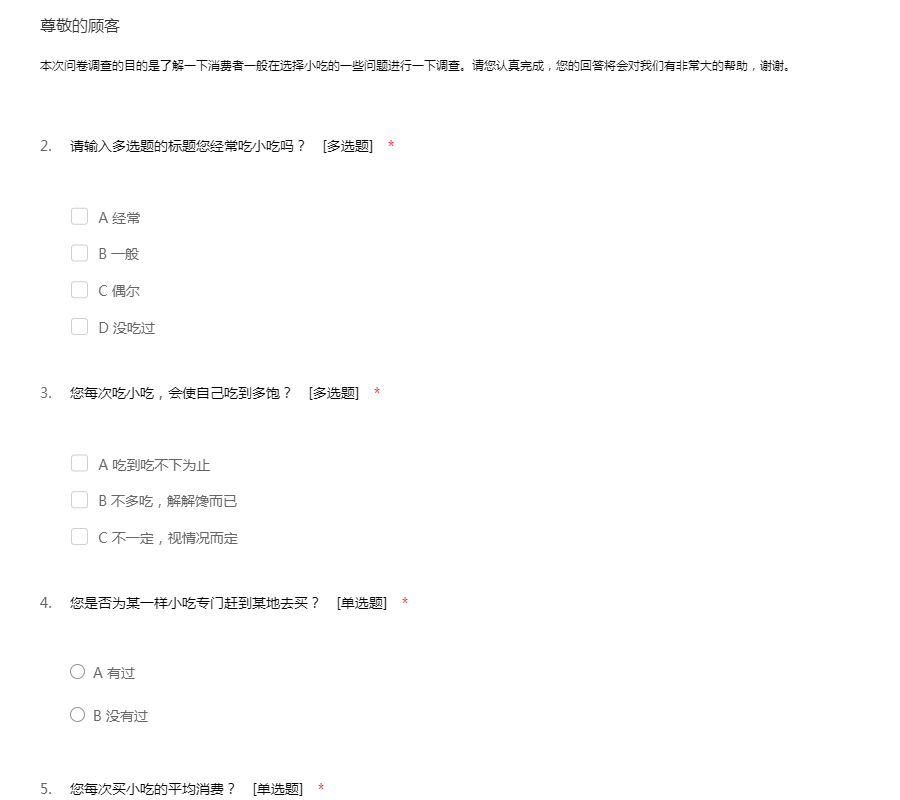 本次问卷调查的目的是了解一下消费者一般在选择小吃的一些问题进行一下调查。请您认真完成,您的回答将会对我们有非常大的帮助,谢谢。