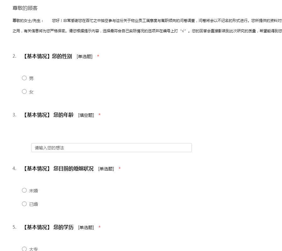 尊敬的女士/先生: 您好!非常感谢您在百忙之中抽空参与这份关于物业员工满意度与离职倾向的问卷调查,问卷将会以不记名的形式进行。您所提供的资料对我们非常重要,答案无所谓对错之分,仅限研究之用,有关信息将为您严格保密。请您根据提示内容,选择最符合自己实际情况的选项并在编号上打“√”。您的回答会直接影响到此次研究的质量,希望能得到您的支持和配合。