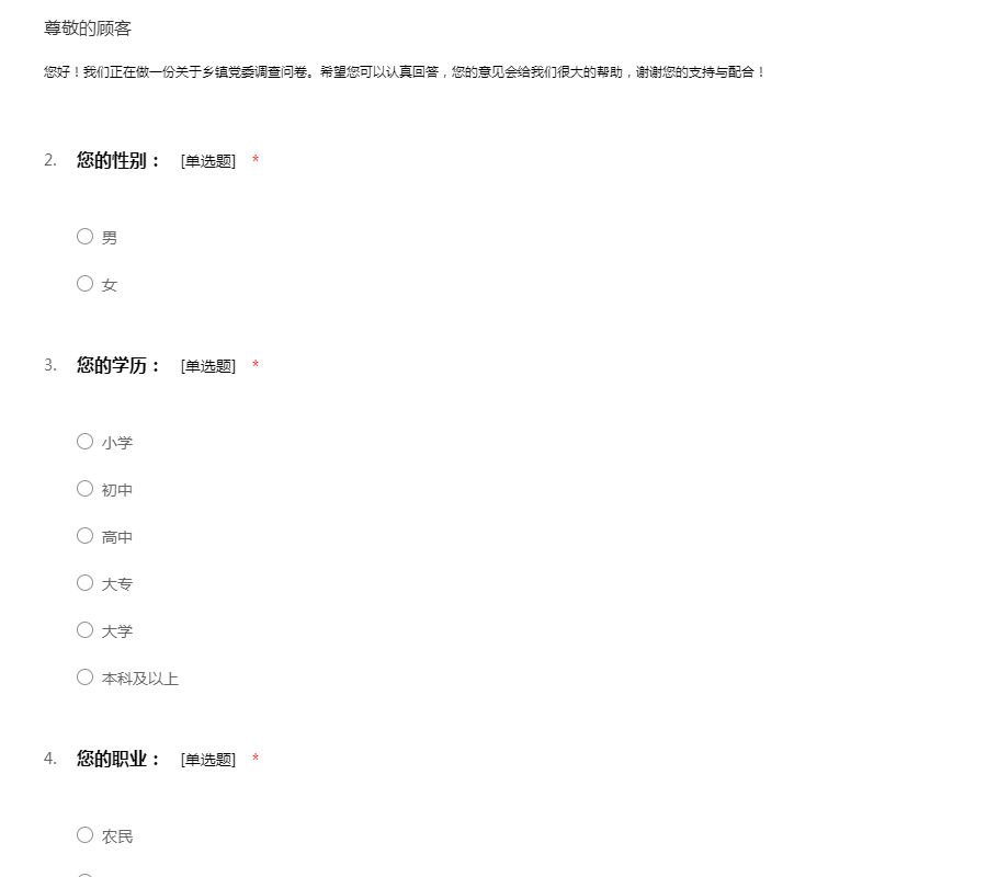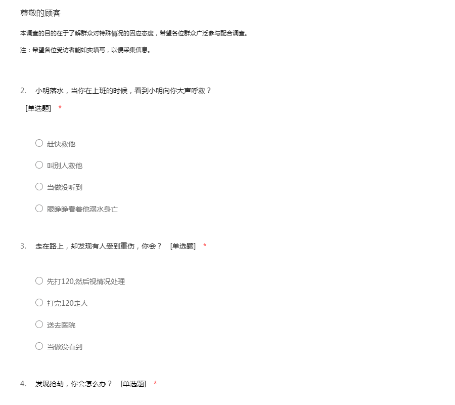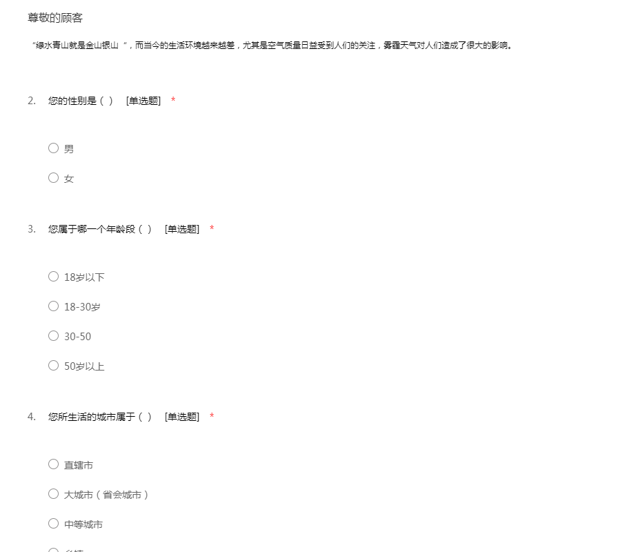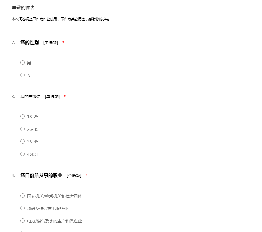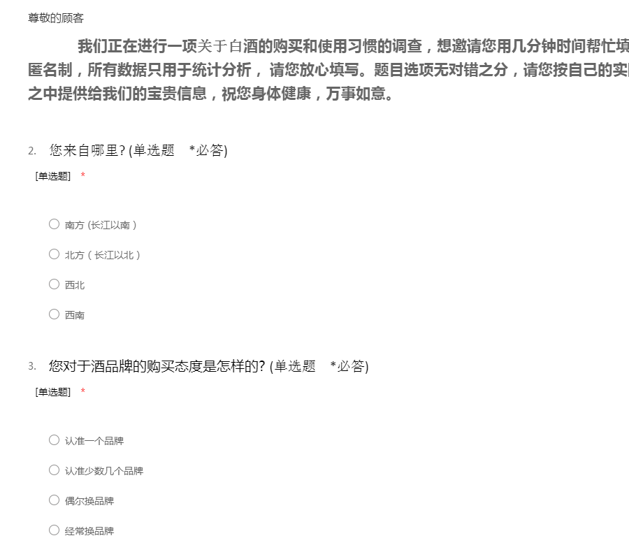 问卷中问题的回答,没有对错之分,您只要根据平时的想法和实际情况回答就行。访问大约要3分钟。对于您的回答,我们将按照统计法的规定,严格保密,并且只用与统计分析,请您不要有任何疑虑。希望您协助我们完成这次访问,谢谢您的合作。