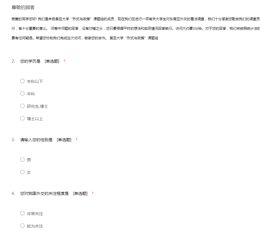 我们是来自复旦大学“形式与政策”课题组的成员,现在我们在进行一项有关大学生对东南亚外交的看法调查,我们十分感谢您配合我们的调查员完成本次问卷。您的合作对于我们调查的顺利进行,有十分重要的意义。
