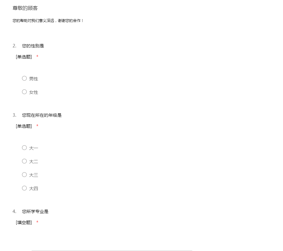 本次问卷调查意在了解当代大学生的恋爱实际情况,您的真实回答对我们来说十分宝贵!感谢您在百忙之中回答此卷!51调查网(我要调查网)谢谢您的参与。